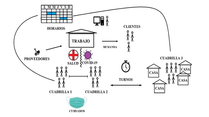 Luego de varias reuniones, se diseñó un modelo aplicable a la actividad productiva, que permitiera determinar un esquema de trabajo en cuadrillas con el fin de minimizar el riesgo de contagio, teniendo en cuenta los requisitos de cuidado de salud de las personas, la carga laboral, los procesos de producción y de comercialización, entre otras condiciones.